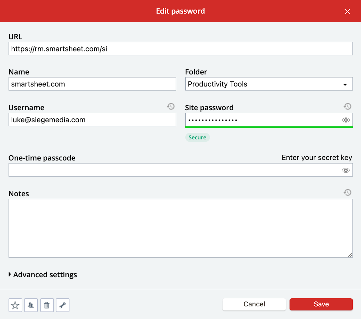 Ok, last Bitwarden design diss (promise!). LastPass makes it easy to modify your passwords—just click the wrench icon that appears when hovering over the website in your dashboard, and you'll see the edit interface below.