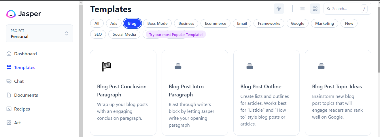 Jasper, on the other hand, has a more complicated process. When you navigate to the blog category from your dashboard, you'll find templates for sections like intro, topic, and conclusion. Seasoned content writers will appreciate this approach because it offers more control to the human writer, but it may be too much for a newbie looking to generate a complete article from scratch.
