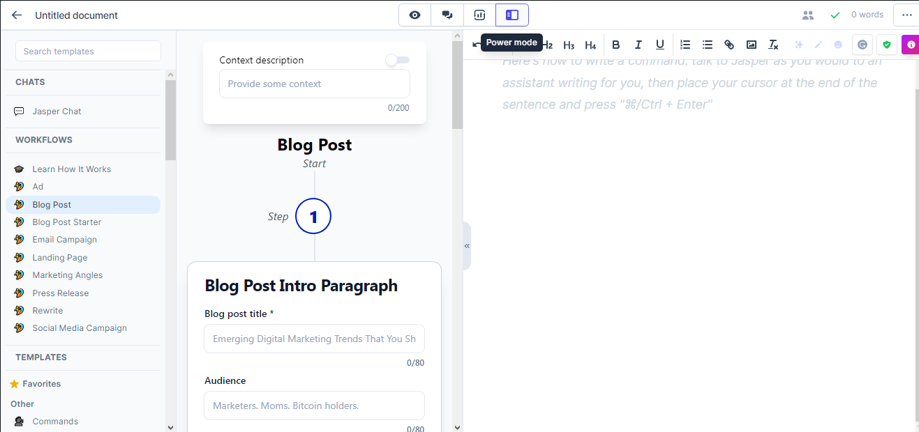 In Chat mode, Jasper becomes a chatbot like ChatGPT. You can converse with it using prompts or speak to it like a real-life writing assistant with voice commands.