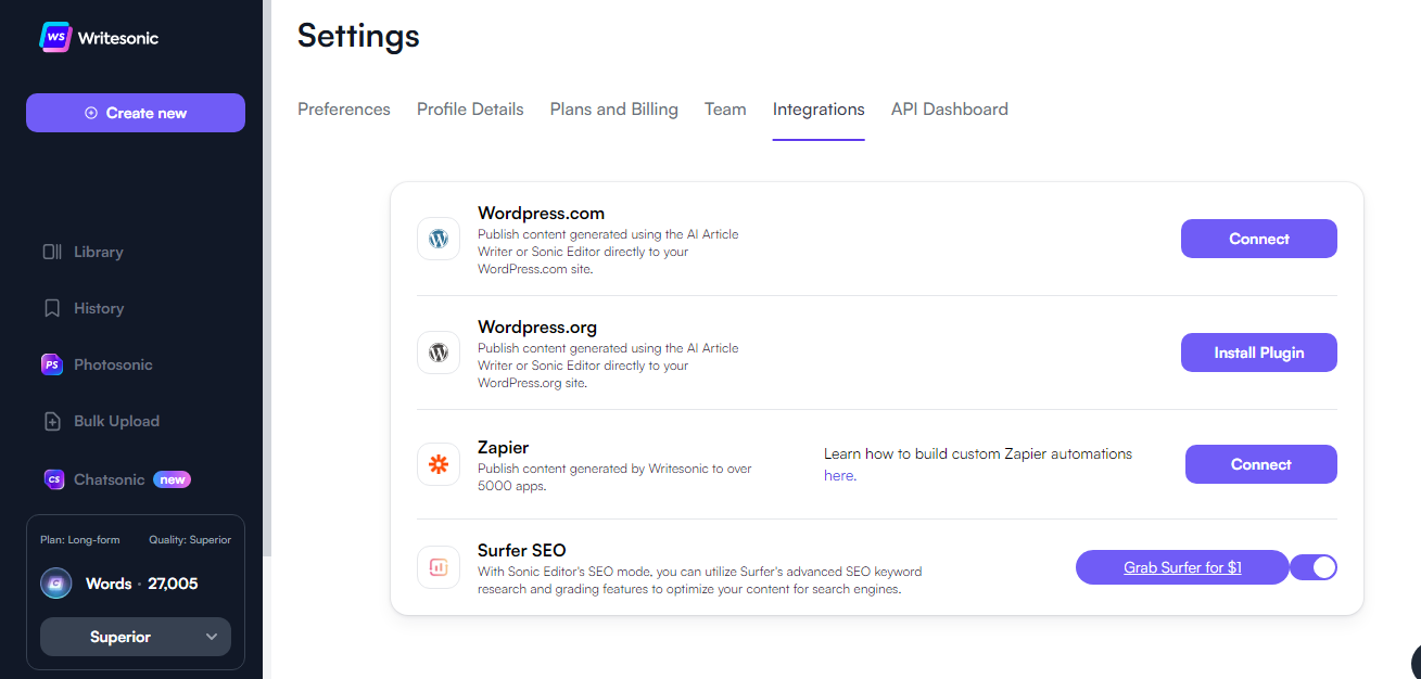 One place Writesonic really shines is with integrations. It integrates with Surfer for SEO, DALL-E for image generation, and Copyscape for plagiarism checking—and it connects to WordPress in one click.