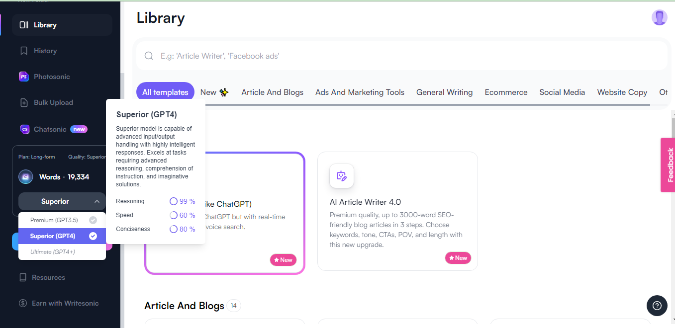 Writesonic, on the other hand, allows you to choose the AI model you want to apply: GPT-3.5, GPT-4, or the forthcoming GPT-4+.